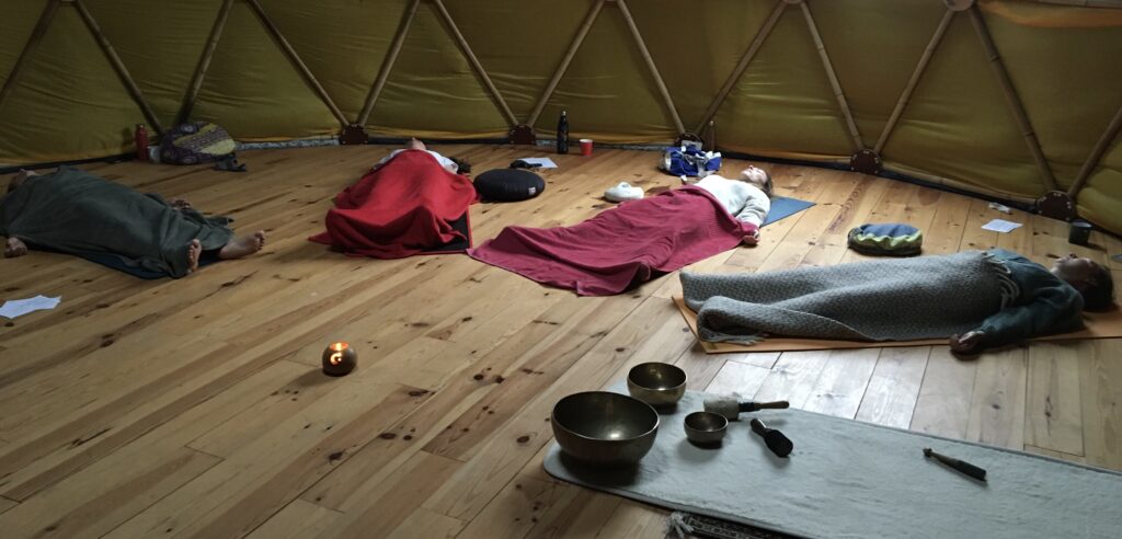 Dans l’idéal, dans une belle salle, je m’installe au centre, les personnes tout autour, allongée, ou assises confortablement, de manière à pouvoir se détendre.